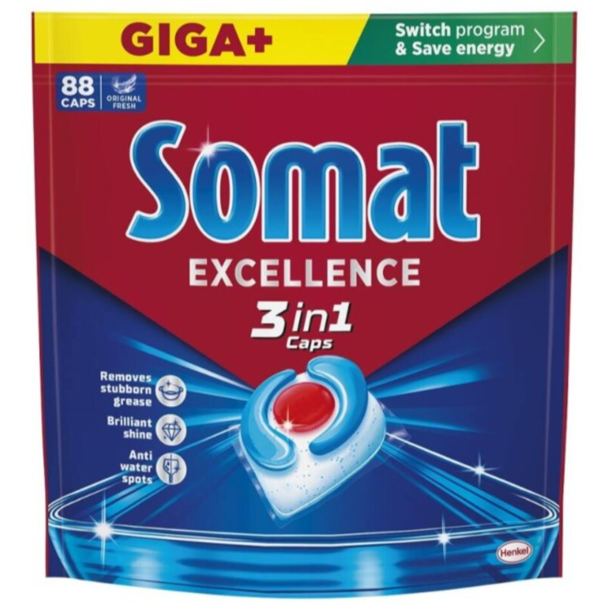 Capsulele Somat Excellence 3in1 pentru masina de spalat vase ofera trei beneficii esentiale: eliminarea resturilor persistente, prevenirea petelor de apa pentru o stralucire deosebita si protectie impotriva coroziunii pentru vasele delicate.