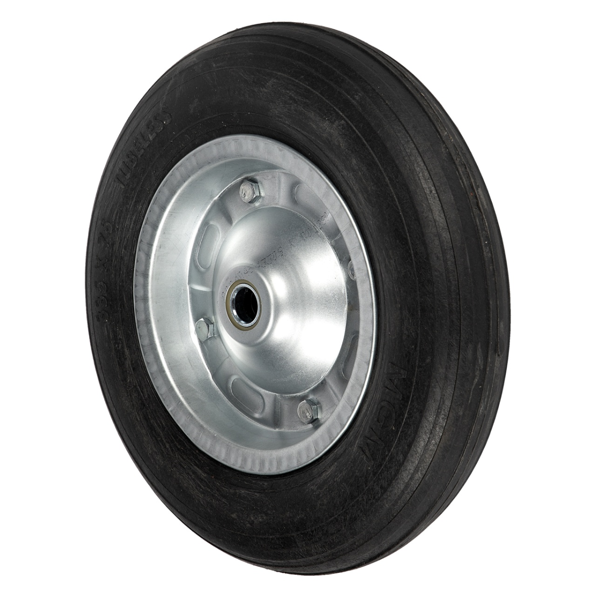 Roata este de tip masiv, ceea ce inseamna ca nu necesita umflare si este rezistenta la pene sau perforatii. Acest lucru o recomanda in mod special pentru utilizarea in zone unde exista riscuri de intepare sau taiere – precum santierele, atelierele de lucru sau terenurile agricole. Modelul masiv turcesc 350-7 utilizat in constructia acestei roti ofera performante superioare in conditii de sarcina si utilizare intensa.