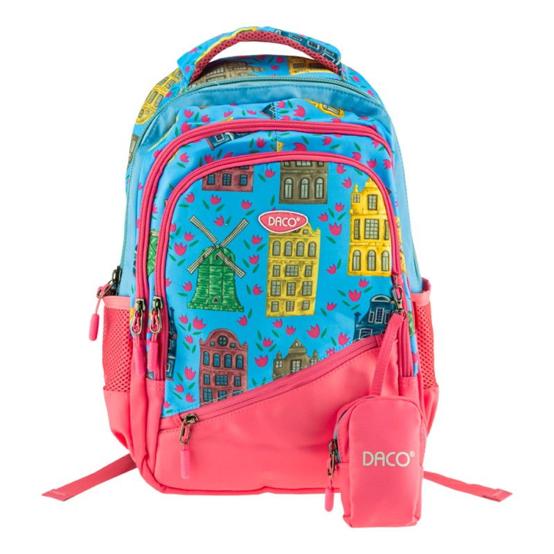 Buzunarul principal este mare, incapator, necompartimentat, potrivit pentru cartile mai mari, cel secundar este compartimentat, ideal pentru instrumentele de scris, cele 2 buzunare frontale sunt mai mici, potrivite pentru depozitarea pachetului sau a obiectelor scolare mai mici, iar cele 2 laterale pentru depozitarea sticlei de apa. De asemenea, ghiozdanul este prevazut cu un portofel exterior, separat, detasabil.