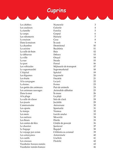 Structurata in 40 de teme (denumiri de meserii, de obiecte, de animale etc) prezentate copiilor intr-o forma grafica atractiva, invatarea limbii franceze devine o distractie.