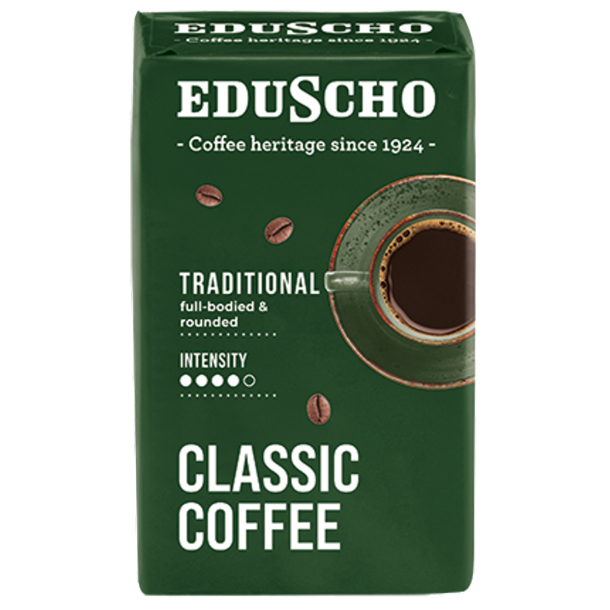 Eduscho Classic Traditional 250g cafea macinata este o miscela de cafea Arabica si Robusta, cu prajire medie si intensitate mare, oferind o aroma echilibrata si bogata, fiind o cafea foarte apreciata in Germania.