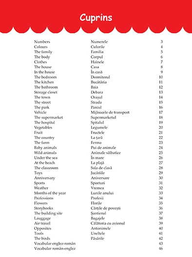 Prin aceasta carte, Editura Prestige ajuta copiii sa invete limba engleza mai usor. Cartea cuprinde aproximativ 480 dintre cele mai uzuale cuvinte din limba engleza. Structurata in 40 de teme (denumiri de meserii, de obiecte, de animale etc) prezentate copiilor intr-o forma grafica atractiva, invatarea limbii engleze devine o distractie.