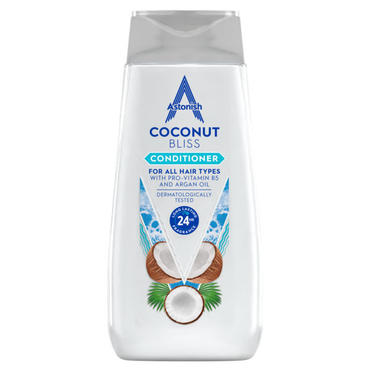 Potrivit pentru toate tipurile de par, acest balsam lasa parul moale, neted si usor de descurcat, oferindu-i in acelasi timp un parfum delicat, exotic si revigorant. Cu o textura cremoasa si usor de aplicat, balsamul ajuta la combaterea efectului de par uscat sau tern, redandu-i supletea si stralucirea naturala. Beneficii: • Potrivit pentru toate tipurile de par • Hidrateaza in profunzime si netezeste firul de par • Usureaza descurcarea si pieptanarea • Lasa parul cu un parfum proaspat de cocos • Formula delicata, ideala pentru utilizare zilnica Cantitate: 375 ml Utilizare: Se aplica pe parul umed, dupa samponare. Se lasa sa actioneze 1-2 minute, apoi se clateste bine. Astonish este un brand britanic de traditie, cu peste 50 de ani de experienta. Afacere de familie ajunsa la a doua generatie, produce in West Yorkshire peste 60 de solutii eficiente de curatare, prietenoase cu mediul si netestate pe animale.