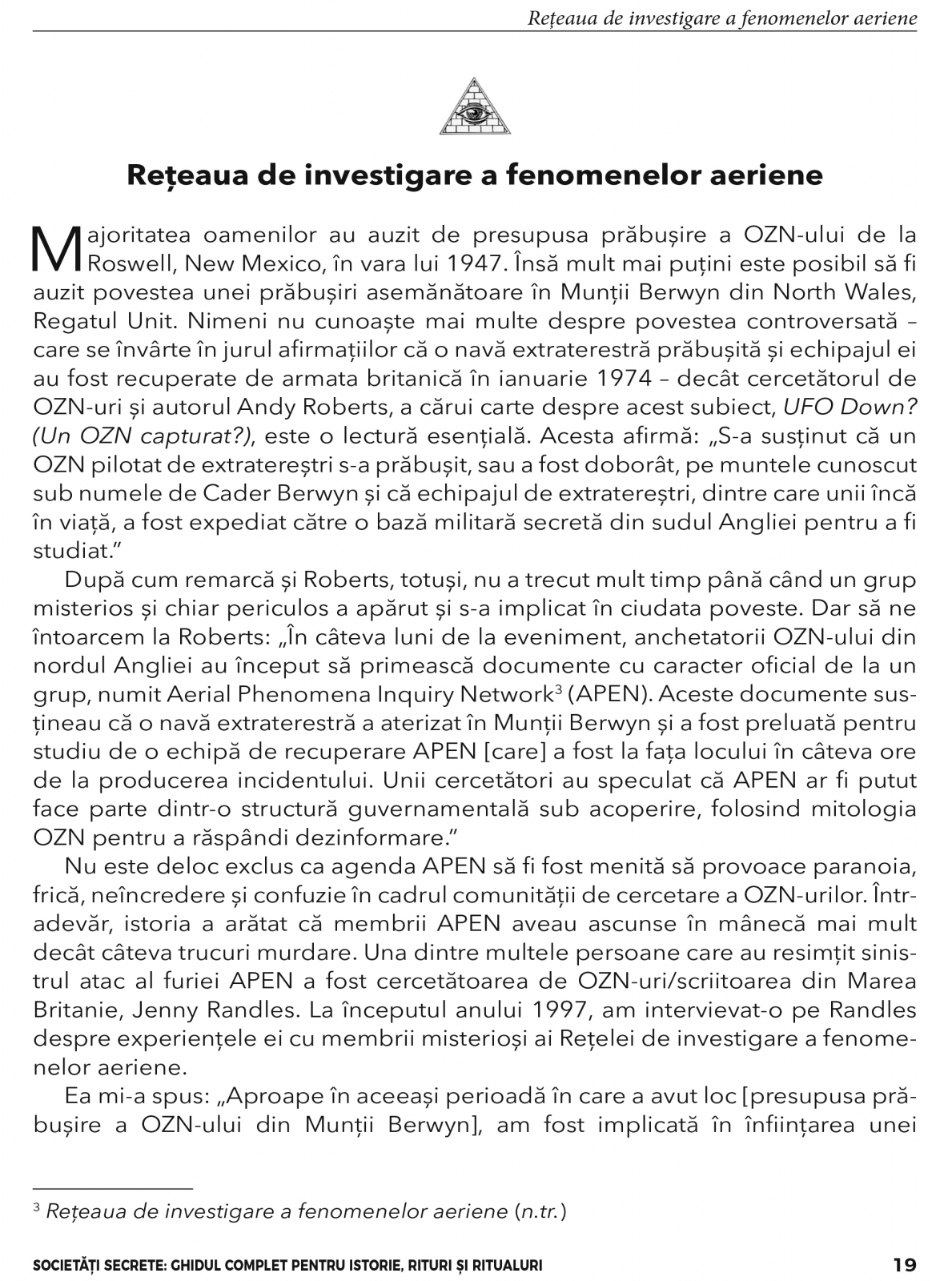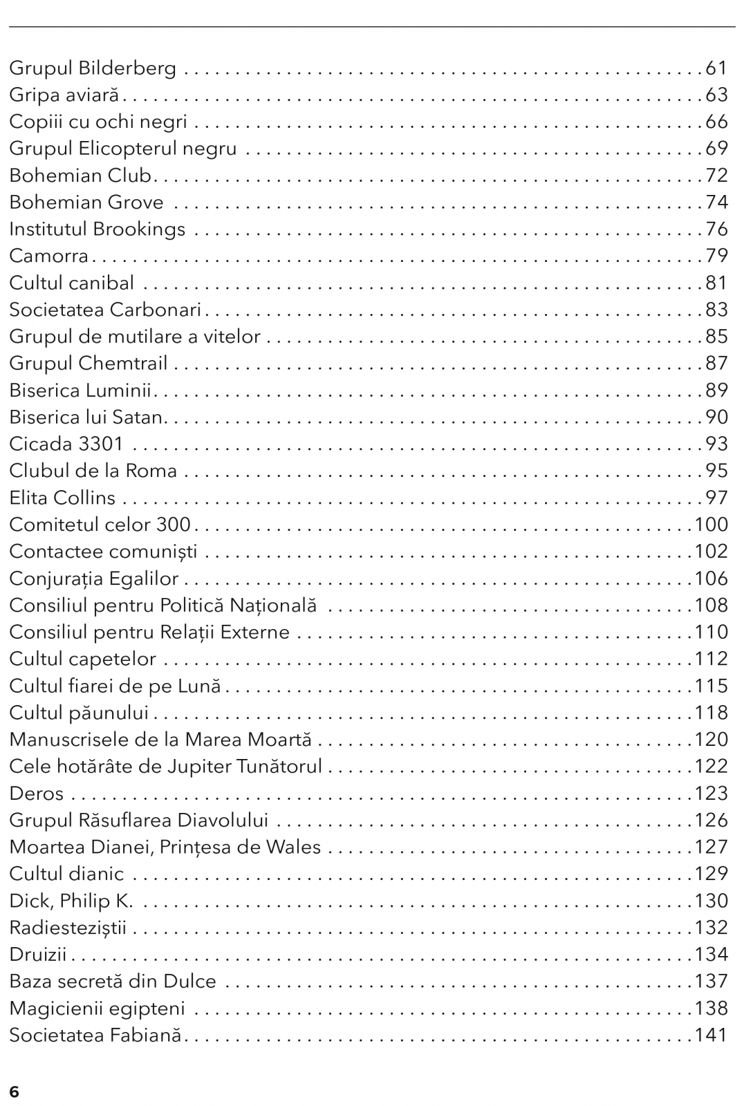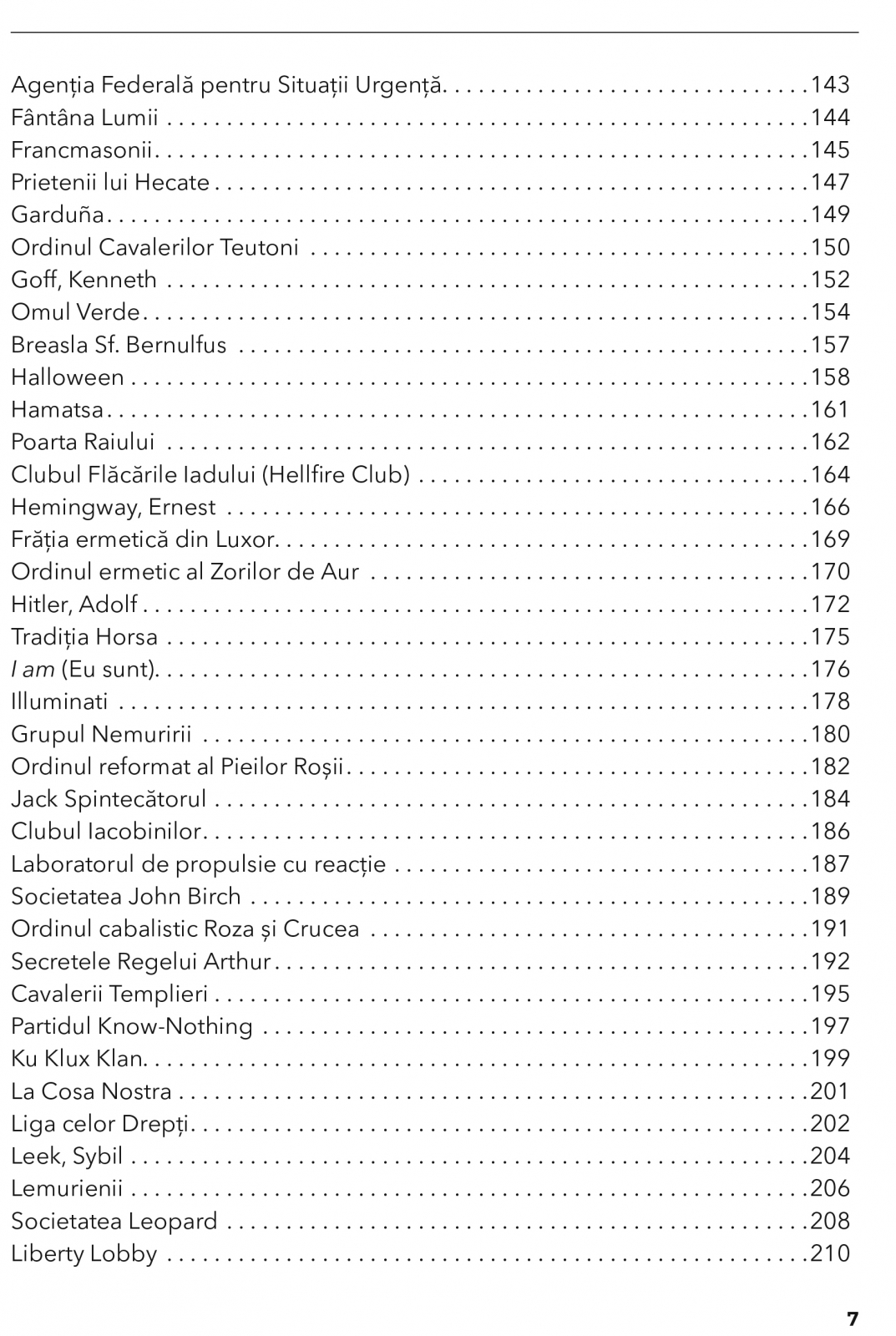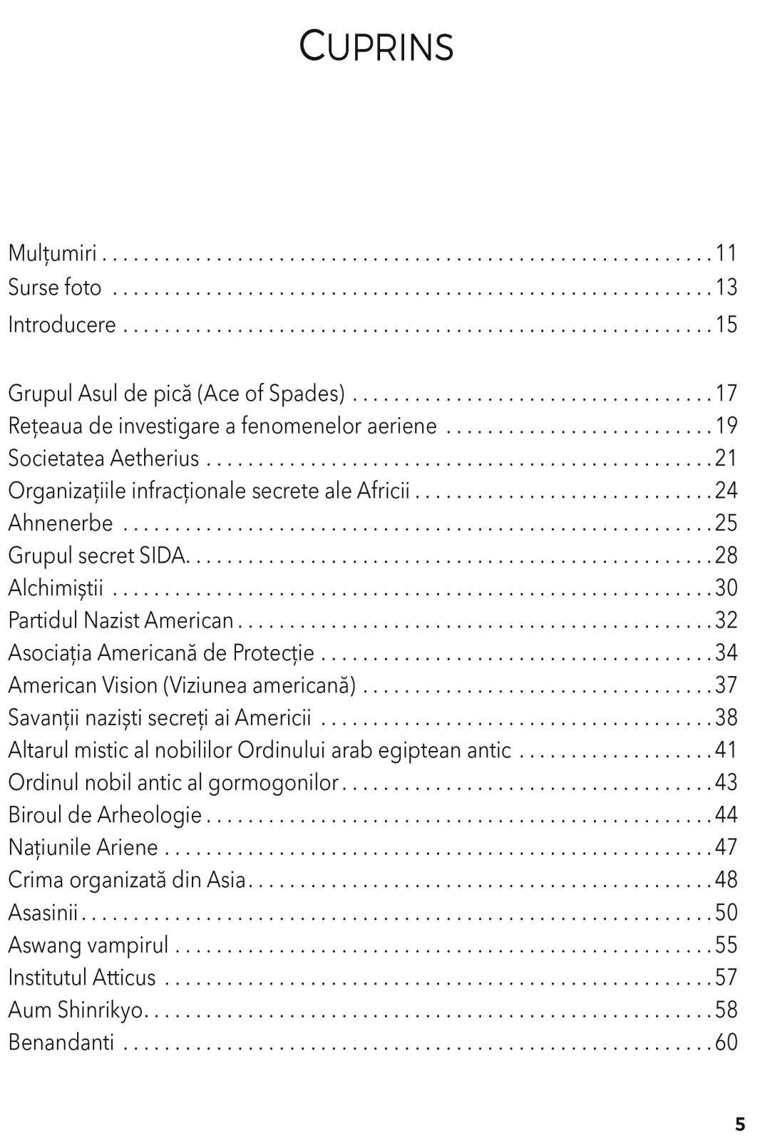Aceasta carte importanta descopera si examineaza istoria ascunsa, trecuta cu vederea si ingropata a unora dintre cele mai cunoscute grupuri, inclusiv Illuminati, Francmasonii, Grupul Bilderberg, MKUltra, Skull and Bones, Ordo Templi Orientis, Agentia Federala de Management al Urgentelor, Ordinul Ermetic al Zorilor de Aur, Cavalerii Templieri, Ku Klux Klan, La Cosa Nostra, Ordinul Rozicrucian Crotona Fellowship, Consiliul pentru Relatii Externe si Proiectul Montauk, pentru a numi doar cateva.