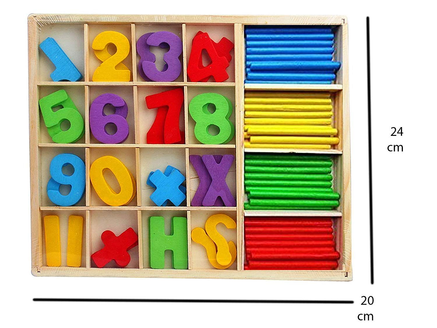 Cutia de studiu este un joc montessori din lemn din categoria Matematica. Acest set de cifre si betisoare colorate este un mod vizual de a preda copiilor calcule matematice si forme geometrice.