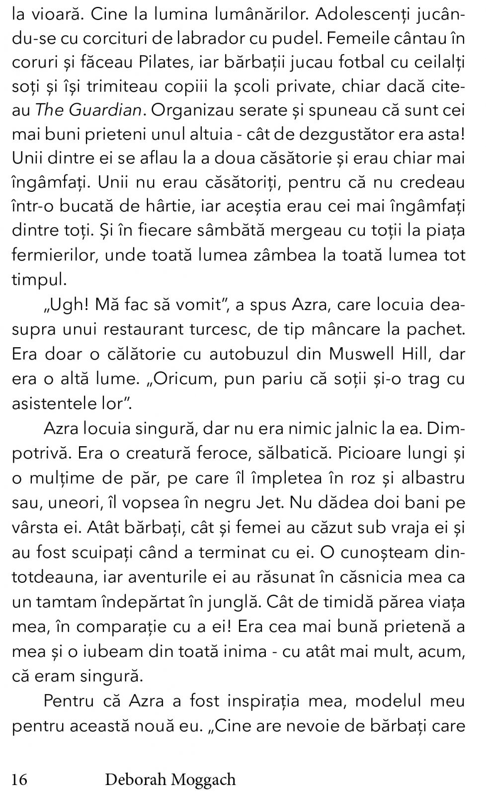 DEBORAH MOGGACH s-a nascut in 1948 si a studiat la Universitatea din Bristol. A lucrat inclusiv pentru Oxford University Press si a predat, inainte de a se lansa ca scriitor, in anii 1970. A scris numeroase carti, thrillere si romane istorice, semnand si doua colectii de nuvele si piese de teatru. Cateva dintre cartile ei au ca tema pierderea copilariei, inclusiv incestul: Porky (1983), Seesaw (1996), Stolen (1990) si To Have and To Hold (1986), adaptate si pentru televiziune. Si romanele Final Demand (2001) si These Foolish Things (2004) au fost ecranizate. A mai semnat adaptarile TV pentru Love in a Cold Climate si Goggle Eyes. O alta ecranizare a scrierilor sale a fost realizata in 2012, The Exotic Marigold Hotel, cu Maggie Smith, Bill Nighy si Judi Dench. Romanul Something to Hide a fost publicat in 2015. De asemenea, Moggach scrie si scenarii de film, cel mai recent fiind cel pentru Pride and Prejudice, cu Keira Knightley in rol principal. Ultima activitate este o adaptare a The Diary of Anne Frank pentru BBC One, in cinci episoade, cu Ellie Kendrick. Moggach este presedinte al Society of Authors, a lucrat in cadrul Comitetului Executiv PEN, asociatie internationala de scriitori si este membru al Royal Society of Literature. Locuieste in Londra.