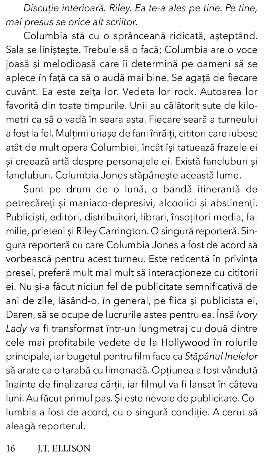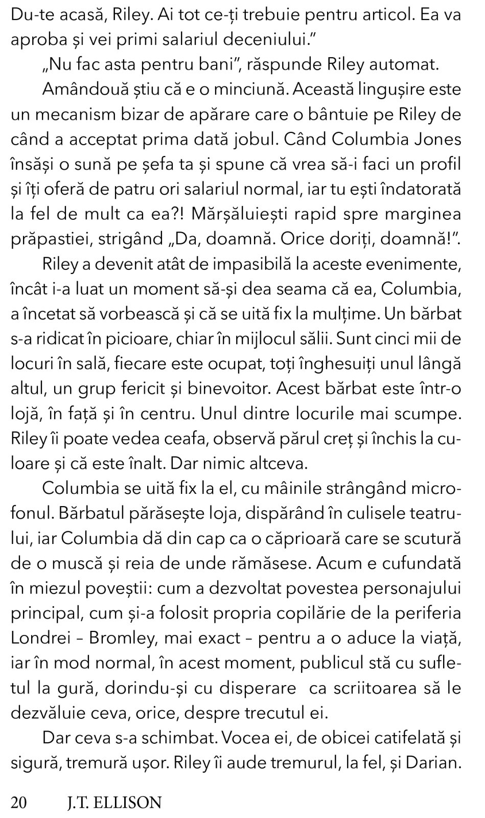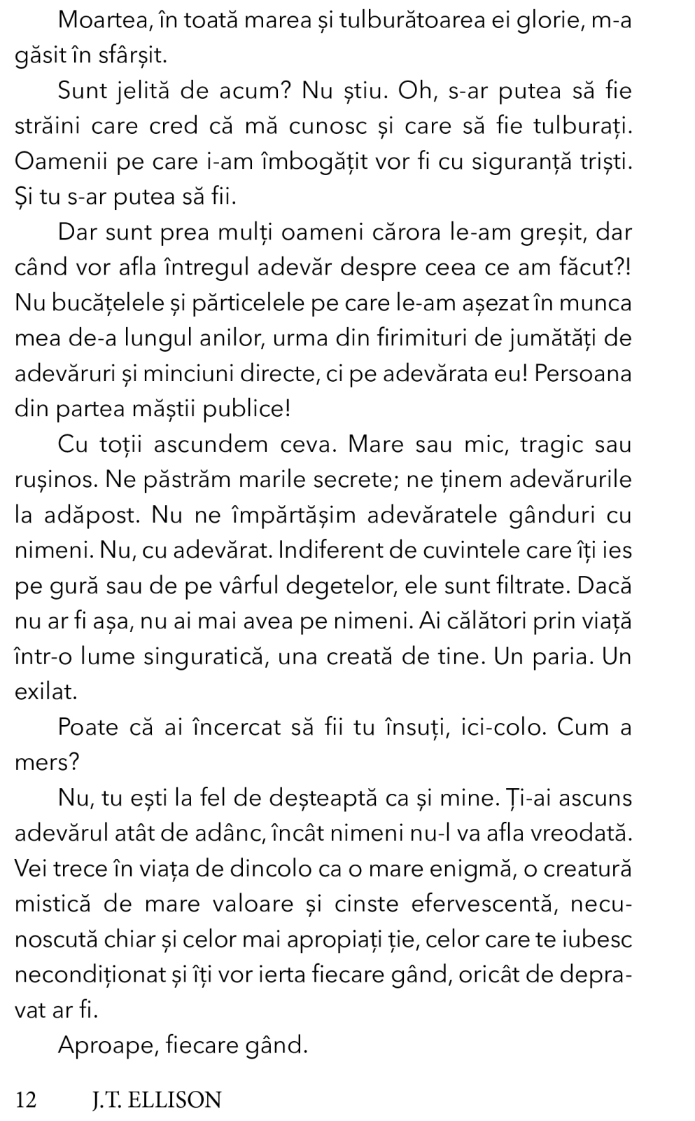 Din partea autoarei de bestsellere J.T. Ellison vine cu un thriller tensionant despre o scriitoare aflata in varful carierei sale, al carei trecut ameninta sa distruga tot ceea ce are – si pe toti cei pe care ii cunoaste.