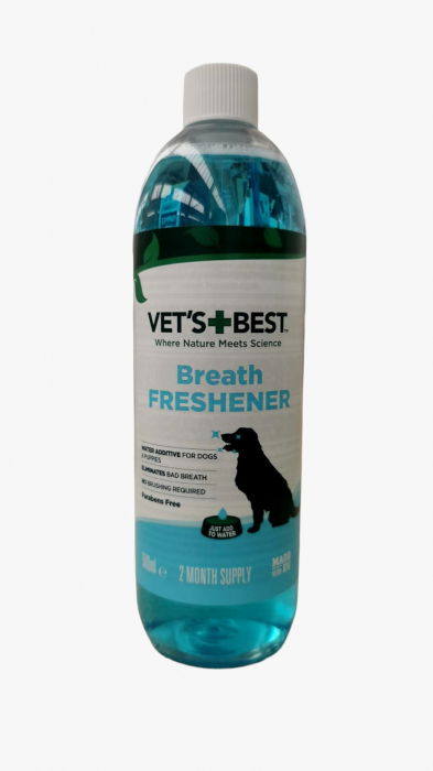 Ajută la menținerea unei respirații proaspete atât pentru câini cât și pentru cățeluși. Este suficient să adăugați o linguriță de produs în apa lor de băut._x000D_ _x000D_ Special formulată cu Ulei de Pepermint, Geranium și Cuișoare pentru o respirație proaspătă. Este destinată exclusiv pentru câini și cățeluși. Ajută la menținerea unei respirații proaspete pentru câini și pentru cățeluși. Este suficient să adăugați o linguriță de produs în apa lor de băut._x000D_ _x000D_ Beneficii:_x000D_ _x000D_ Deodorizează respirația câinilor și cățelușilor_x000D_ Conține agenți antibacterieni naturali_x000D_ Doar trebuie adăugat în apa de băut_x000D_ Ingrediente: Apă, glicerină, polisorbat 20, benzoat de sodiu, sorbat de potasiu, ulei de Mentha Piperita (izmă de grădină), ulei de Eugenia Caryophyllus (frunze de cuișoare), ulei de Pelargonium Graveolans (mușcată dulce), acid acitric, CI 42090._x000D_ _x000D_ Modalitate de folosire: Agitați bine înainte de folosire. Adăugați o linguriță de produs (aprox 5ml) în apa de băut a animalului de companie. Pentru rezultate optime recomandăm folosirea gelului dentar Vets Best ca parte a unei igiene totale a cavității bucale. O sănătate orală bună este importantă în sănătatea globală a animalului de companie. Recomandăm vizite periodice la veterinar pentru menținerea sănătății orale.