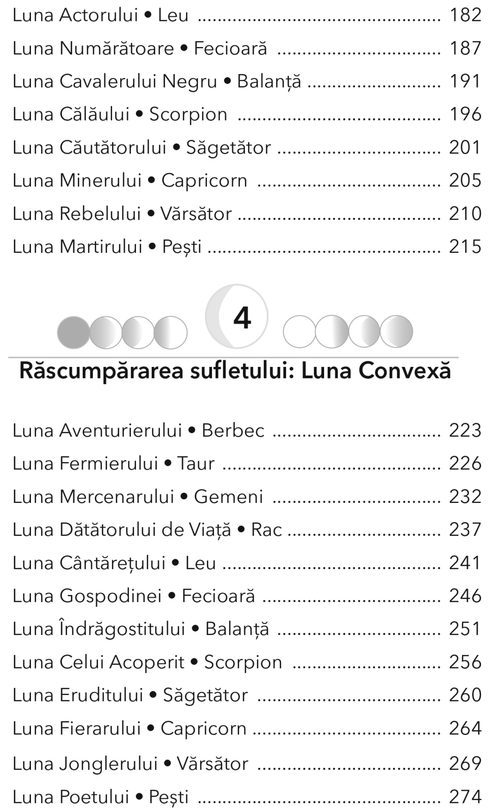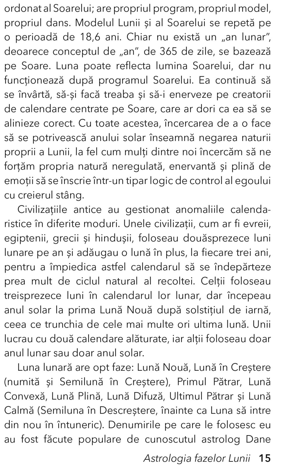 Fazele mereu schimbatoare ale Lunii ofera o modalitate de a ne aprofunda intelegerea semnului nostru lunar natal, precum si influenta zilnica a Lunii asupra valurilor noastre emotionale. Prin cele 8 faze ale sale si prin dansul sau ratacitor prin fiecare dintre cele 12 semne ale Zodiacului - de la Luna Pruncului (Luna Noua din Berbec) la Luna Povestitorului (Luna Plina din Gemeni) si la Luna Profetului (Luna Calma din Varsator) - Luna isi impartaseste povestea in 96 de moduri diferite.