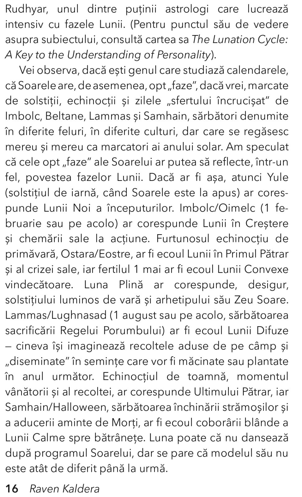 Spunand povestile de suflet ale tuturor celor 96 de combinatii de faze si semne ale Lunii, Raven Kaldera explica darurile creative si provocarile emotionale conferite celor nascuti sub fiecare arhetip al Lunii, precum si cum sa cultivam trasaturile pozitive si sa le imbunatatim - sau cel putin sa le descurajam pe cele negative. Explorand influentele pe care fiecare arhetip al Lunii le are asupra noastra pe masura ce trece, autorul dezvaluie care Luni sunt cele mai dificile, ce calitati innascute scoate fiecare Luna la iveala in noi si ce putem face pentru a onora fiecare Luna. Incluzand citate evocatoare care lumineaza natura fiecarei Luni, Kaldera arata cum sa folosesti semnul si faza astrologica a Lunii natale pentru a-ti gasi „Lunile ascunse” - umbrele aruncate de Lunile trecatoare - si sa prezici cum te vor afecta Lunile actuale si cele care se apropie.